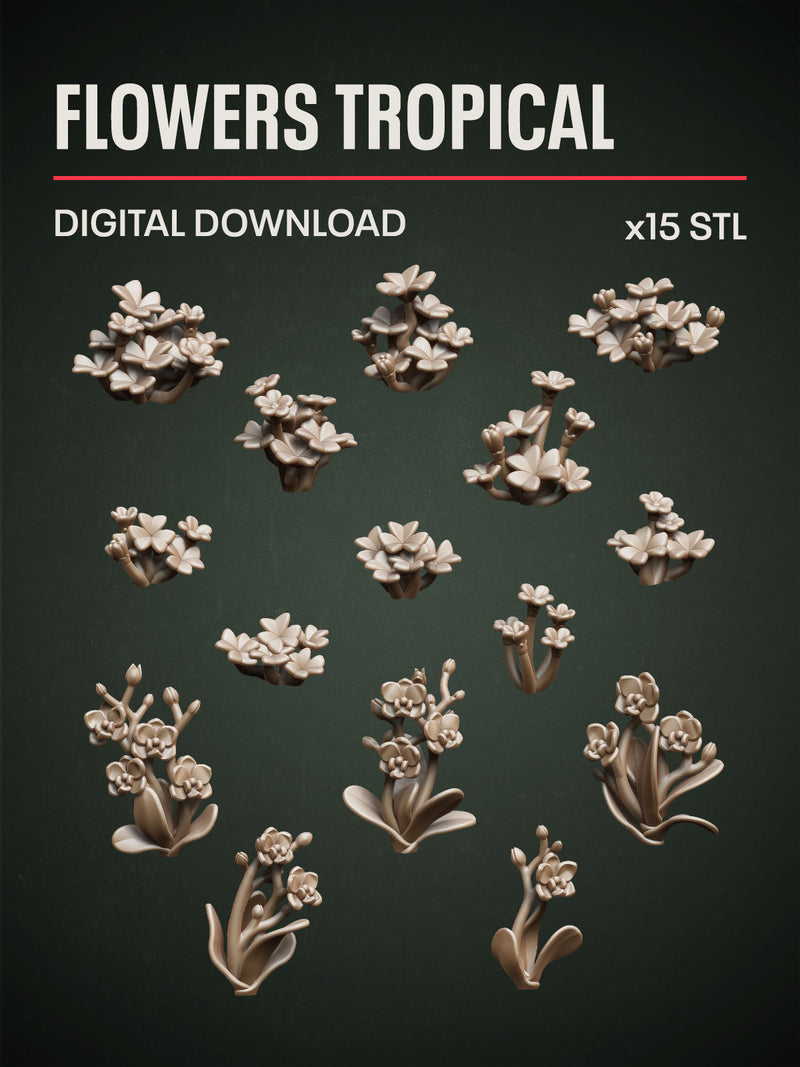 The Flowers Tropical STL pack provides clover-like Oxalis flowering plants and popular Orchid flowers as 3D printable basing components.