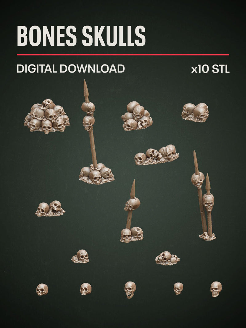 The Bones Skulls STL pack provides various skulls and piles of skulls and skulls on pikes as 3D printable basing components.