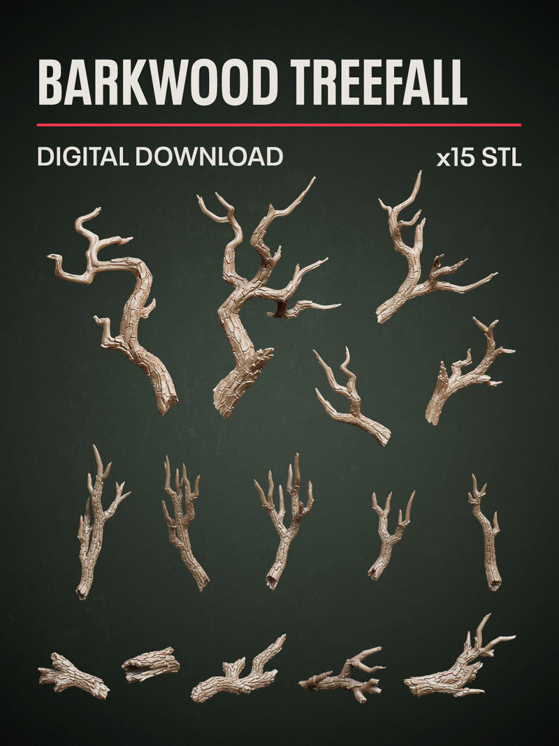 The Barkwood Treefall STL pack provides fallen limbs and logs with a mix of light and heavy bark texture as 3D printable basing