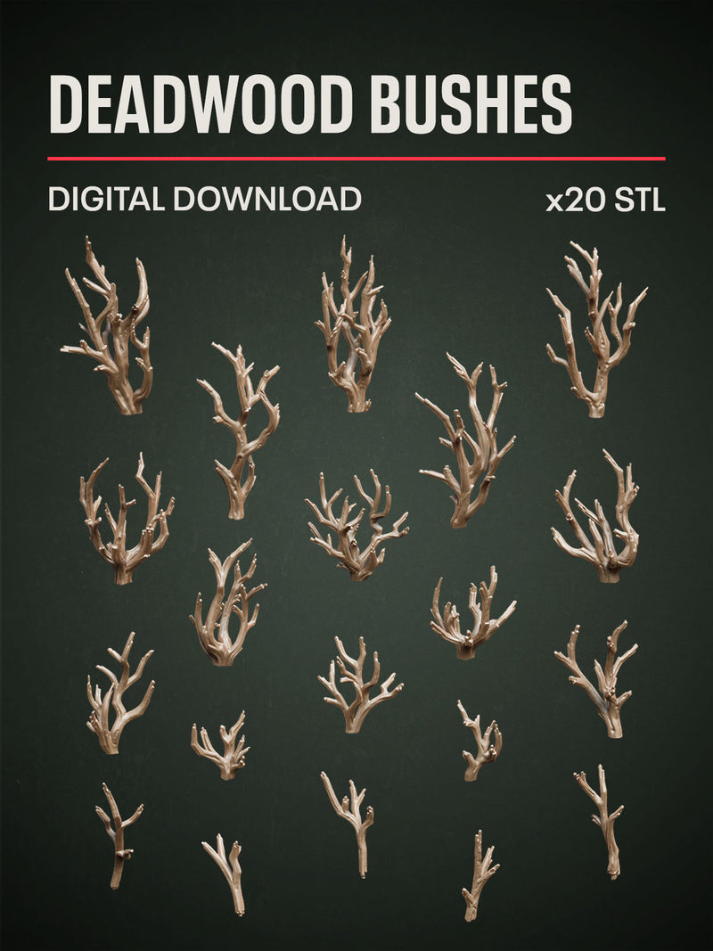 The Deadwood Bushes STL pack provides dried shrubs and weathered desert vegetation as 3D printable basing components.