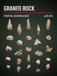 The Granite Rock STL pack provides granite textured rocks, rock piles and boulders as 3D printable basing components.