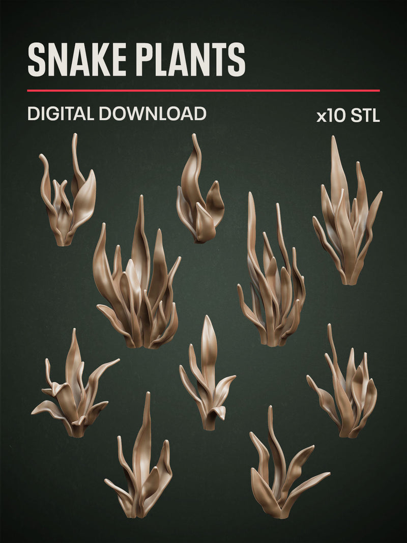 The Snake Plants STL pack provides upright sword-shaped succulent leaves as 3D printable basing components.