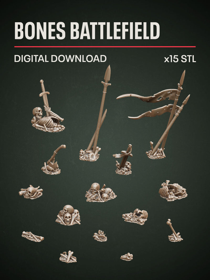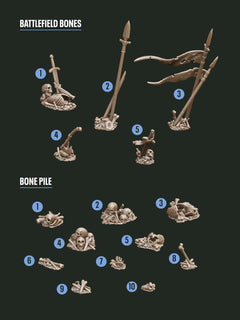 The Bones Battlefield STL pack provides 3D printable basing components featuring the remains of fallen warriors scattered across the battlefield.