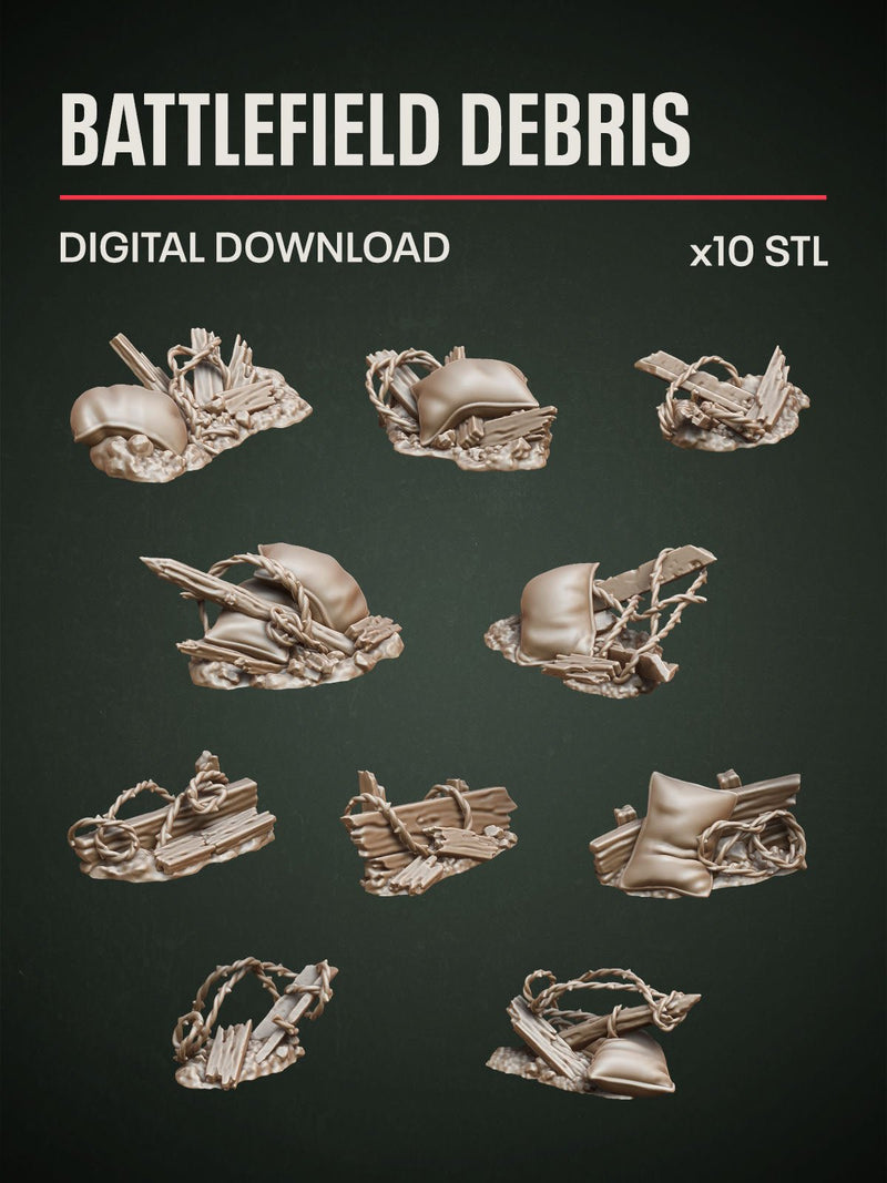 The Battlefield Debris STL pack provides scattered combat wreckage including a mix of sandbags, wood scraps, obstacles and barbed wire as 3D printable basing components.