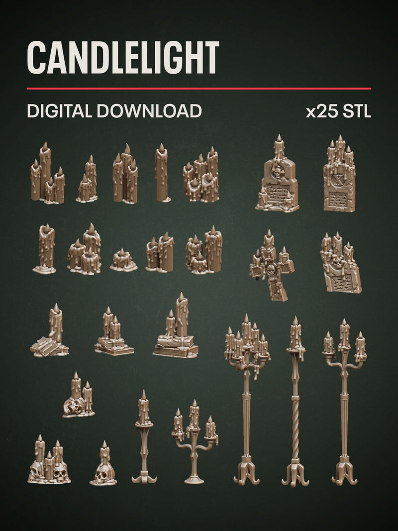 The Candlelight STL pack provides flickering candles dripping wax and mounted on books, skulls, grave markers and candelabras for atmospheric dungeon and gothic scenes as 3D printable basing components.