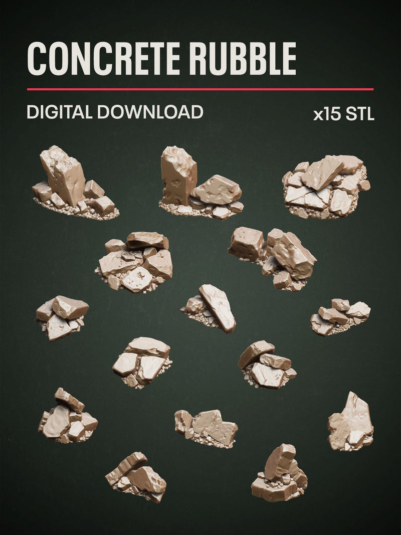 The Concrete Rubble STL pack provides broken chunks and demolished building fragments as 3D printable basing components.
